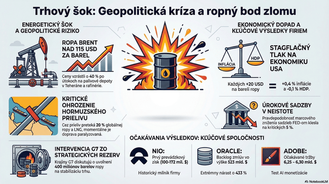 Za posledný týždeň vzrástol Brent o takmer 40 % a dnes ráno sa krátko obchodoval nad 115 dolármi. Hormuzský prieliv, cez ktorý za normálnych podmienok prechádza 20 % globálnej ropy aj LNG, je efektívne uzatvorený. Technicky je otvorený — ale žiadna shipping spoločnosť nie je ochotná riskovať prechod pod hrozbou rakiet a dronov. Výsledok je rovnaký.