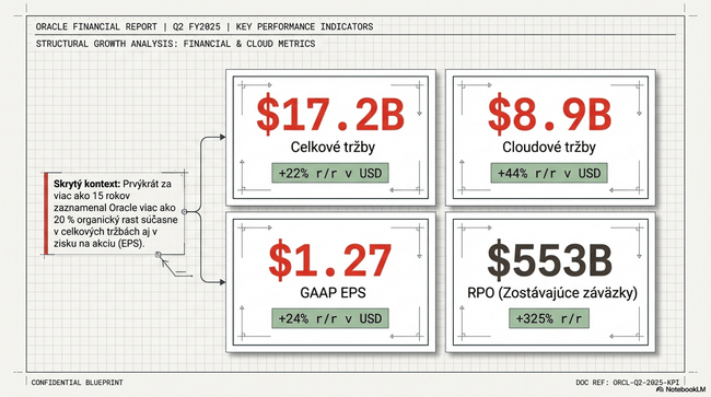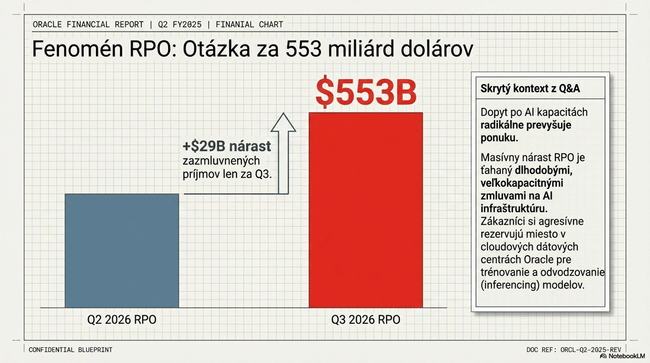 17,2 miliardy dolárov celkových tržieb. 8,9 miliardy v cloude. EPS 1,27 dolára. A to číslo vpravo dole — 553 miliárd dolárov v podpísaných budúcich kontraktoch, rast o 325 % za rok. Oracle nebol takto silný od éry pred smartfónmi. A práve začína.