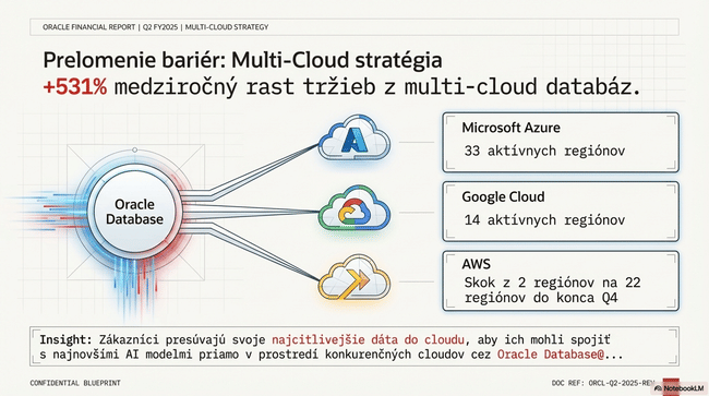 Desaťročia odmietalo Oracle pustiť svoju databázu do cudzích cloudov. Potom prišli dohody s Microsoft Azure, Google Cloud a Amazon AWS. A starí zákazníci, ktorí chceli Oracle databázu tam, kde už bežali ich workloady, konečne dostali čo chceli. Výsledok: 531 % rast za rok. AWS ide z 2 regiónov na 22 do konca tohto kvartálu. Toto je skrytá zlatná baňa v celom reporte.