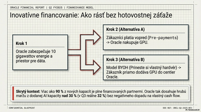 Oracle zabezpečil 10 gigawattov energie a priestoru pre dáta. To stojí obrovské peniaze. Ale tu je geniálna časť: viac ako 90 % novej kapacity financujú samotní zákazníci. Buď platia vopred (Oracle za tie peniaze kúpi GPU), alebo prinesú vlastný hardware. Oracle len prevádzkuje. Hrubá marža 32 % — bez toho, aby Oracle musel vydávať nové akcie alebo sa zadlžovať nad dohodnutý strop.