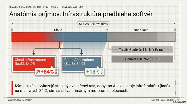 Celý život bol Oracle softvérová firma. Databázy, licencie, support. Cloud infraštruktúra (IaaS) teraz rastie o 84 % ročne a stáva sa primárnym motorom firmy. Aplikácie rastú solídnych 13 %. Ale IaaS je raketou. Dopyt po AI výpočtovom výkone mení DNA celej spoločnosti pred našimi očami.
