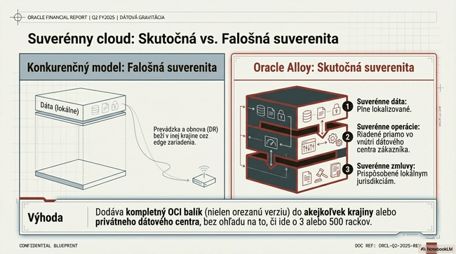 Konkurenti ponúkajú "sovereign edge zone" — dáta lokálne, ale disaster recovery beží v inej krajine cez edge zariadenia. To dnes nestačí žiadnej vláde ani regulátorovi. Oracle Alloy dodáva kompletný OCI balík — suverénne dáta, suverénne operácie, suverénne zmluvy — do akejkoľvek krajiny alebo privátneho dátového centra. Či sú to 3 racky alebo 500. Celý Oracle v suverénnej bubline. Nikto iný toto neponúka.