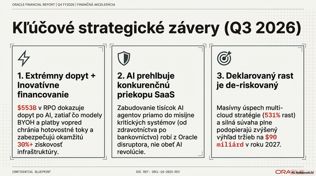 Jedna: extrémny dopyt plus inovatívne financovanie. $553 miliárd RPO, model BYOH a platby vopred chránia cash flow a zabezpečujú 30 %+ ziskovosť infraštruktúry. Dva: AI prehlbuje konkurenčnú priekopu SaaS. Tisíce agentov v misijne kritických systémoch robí z Oracle disruptora, nie obeť. Tri: deklarovaný rast je de-riskovaný. $90 miliárd v roku 2027 nie je wish list. Je to podpísaný backlog pretavený do čísiel.