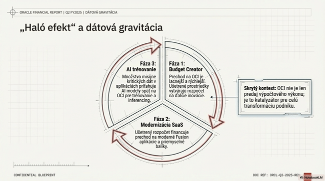 Zákazník prejde na OCI, lebo je lacnejší a rýchlejší. Ušetrené peniaze použije na modernizáciu aplikácií (Fusion ERP, HCM, SCM). Misiine kritické dáta v aplikáciách priťahujú AI modely naspäť na OCI pre trénovanie. Kruh sa uzatvára. Každý vstupný bod vedie hlbšie do ekosystému Oracle. Toto je dátová gravitácia v praxi.