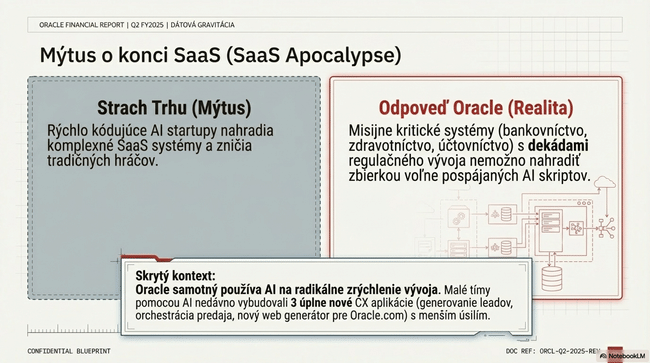 Strach znie rozumne. Realita je iná. Skúste nahradiť core banking systém, elektronický zdravotný záznam alebo ERP s desaťročiami regulačného vývoja zbierkou voľne pospájaných AI skriptov. Žiadny riaditeľ nemocnice ani banky vám to nedovolí. A Oracle medzitým sám používa AI na vývoj — malé tímy postavili 3 úplne nové CX aplikácie vrátane nového Oracle.com. Disruptor nie je ten, kto sa bojí. Je to ten, kto útočí.