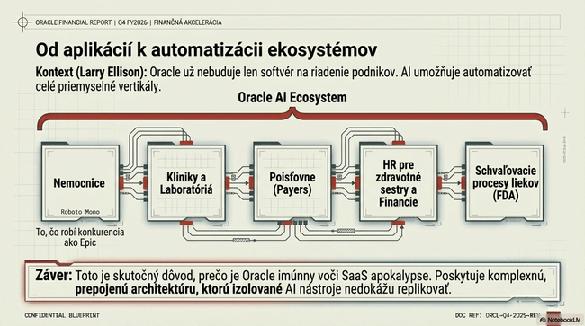 Oracle prestáva byť firmou, ktorá robí softvér na riadenie podnikov. Stáva sa firmou, ktorá automatizuje celé priemyselné vertikály. V zdravotníctve: nemocnice, kliniky, laboratóriá, poisťovne, HR, FDA schvaľovacie procesy — jeden prepojený ekosystém. Konkurencia ako Epic robí len nemocnice. Oracle robí celé zdravotníctvo. AI toto umožnila. A Oracle ju má.