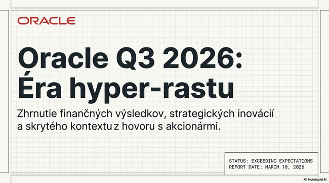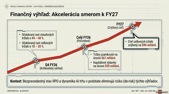 Q4 FY26: cloud rastie 44 až 48 %, celkové tržby 18 až 20 %. Celý FY26: 67 miliárd, CapEx 50 miliárd. FY27: guidance zvýšený na 90 miliárd dolárov. Kľúčový detail: $553 miliárd v RPO a dynamika AI trhu v podstate eliminujú riziko, že tieto čísla nesplnia. Backlog je väčší ako samotný ročný guidance. To sa v histórii Oraclu nestalo nikdy.