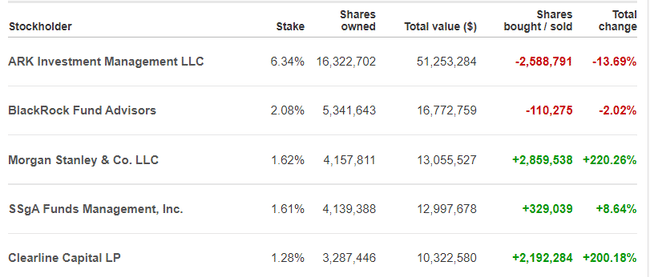 Z tabuľky môžeme vidieť, že o túto spoločnosť sa zaujímajú globálne známe fondy ako ARK Investment, BlackRock, či Morgan Stanley.