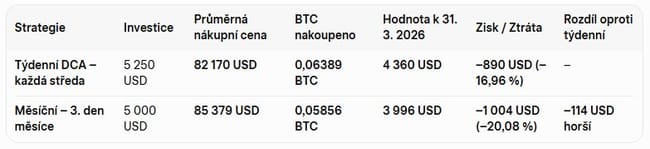 Reálný 5měsíční test plně potvrdil naše dlouhodobé předpoklady: týdenní DCA ve středu je v období volatility výrazně výhodnější než měsíční nákup na fixní den. Rozdíl není obrovský, ale v kryptu se i 3–4 % v průměrné ceně přetaví do stovek až tisíců dolarů navíc při budoucím růstu.