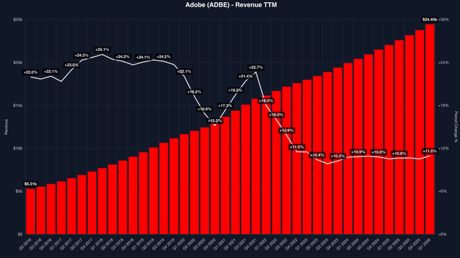 Jen se podívejme na takové $ADBE - kde tržby ukázkově rostou nahoru! Každopádně, od začátku roku si i přesto společnost odepisuje něco kolem 30 % .