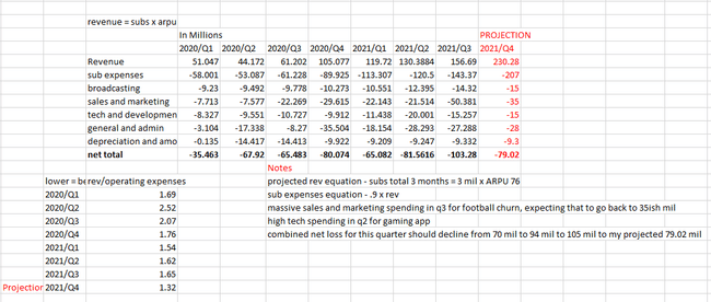 ARPU společnosti rostlo o přibližně 2 dolary na výdělek s předpokládaným ARPU 76 dolarů pro toto 4. čtvrtletí. Vzhledem k 1 milionu předplatitelů x 3 měsíce za 4. čtvrtletí to znamená 3 miliony předplatitelů x ARPU 76 dolarů, což dává zhruba 230 milionů dolarů oproti jejich plánovaným 200 milionům dolarům.