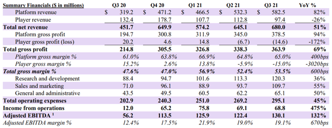 Společnost $ROKU sice nedosáhla na tržby, nicméně mediální společnost se ve 3Q21 těšila silnému růstu tržeb a zlepšující se monetizaci uživatelů. Tržby Roku ve třetím čtvrtletí meziročně vzrostly o 51 % na rekordních 680 milionů dolarů, zatímco hrubý zisk se meziročně zvýšil ještě rychleji o 69 % na 363,9 milionu dolarů. Marže platformy zůstaly vysoké, na úrovni 65 %, a příjmy z provozní činnosti společnosti Roku se meziročně zvýšily 5,7×.