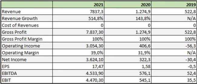 Níže vidíme několik klíčových finančních ukazatelů. Čísla z roku 2019 nemůžeme použít k ničemu jinému než k určitému kontextu. Společnost Coinbase ve velmi velkém měřítku zvýšila své tržby jak v letech 2019 až 2020, tak v letech 2020 až 2021, ale ještě zajímavější je, že jí roste i provozní marže.