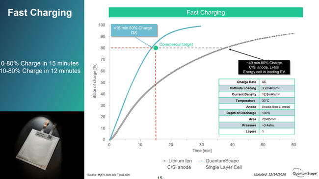 "Polovodičové baterie" vydrží více nabíjecích cyklů a nabízejí vyšší hustotu energie než tradiční autobaterie, což je možné právě díky pokroku společnosti $QS v oblasti lithiových anodových baterií. Lithiové anodové baterie vyžadují méně kovů vzácných zemin, jako je kobalt a lithium, protože zcela postrádají katody.