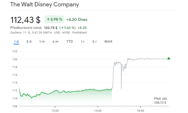 Na základě výsledků si připisují akcie $DIS 7,43%, přičemž za poslední měsíc vzrostly už o 20,07%.