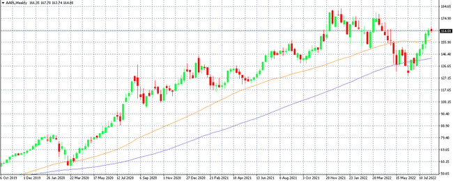Graf č. 1: Akcie společnosti Apple v platformě MT4 na časovém rámci W1 společně s 50 a 100 denním klouzavým průměrem