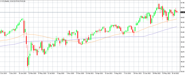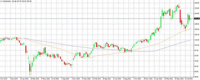 Graf č. 4: Akcie společnosti Chevron Corp v platformě MT4 na časovém rámci W1 společně s 50 a 100 denním klouzavým průměrem