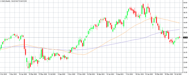 Graf č. 2: Akcie společnosti Bank of America v platformě MT4 na časovém rámci W1 společně s 50 a 100 denním klouzavým průměrem