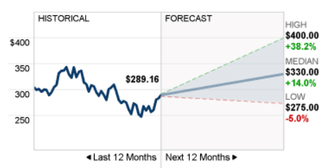 Môžeme vidieť zhodu TipRanks a analytikov z Money.CNN, ktorí taktiež vidia median na hodnote okolo 330 USD a High na 400 USD, čo v oboch prípadoch ponúka pekné zhodnotenie.