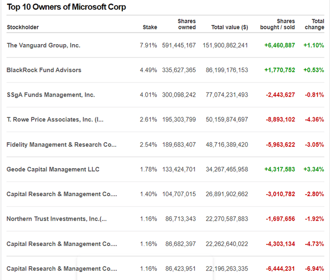 Z tabuľky môžeme vidieť, ktoré fondy držia akcie Microsoftu. Zvučné mená ako The Vanguard, BlackRock, T.Rowe, Fidelity, či Captial Research asi nikoho neprekvapia, nakoľko toto je technologický gigant, ktorému verí asi každý investor. Pozitívne zmeny v pozíciach môžeme pozorovať u The Vanguard, BlackRock, či Geoge Capital. Naopak SSgA Funds, T.Rowe, Fidelity a ďalší sa "zbavovali" akcií.