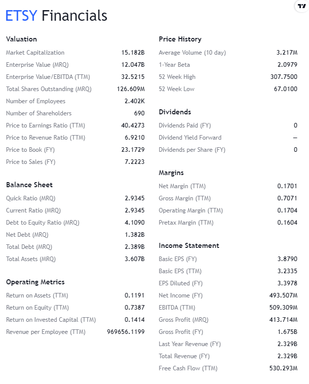 Etsy $ETSY je online tržiště, kde mohou talentovaní lidé vydělávat peníze prodejem svých ručně vyráběných produktů. Na Etsy jsou ~4 miliony aktivních prodejců, ~80 milionů nabídek a ~70 milionů aktivních kupujících. Tržby 2,33 miliardy, tržní kapitalizace 15,18 miliardy.