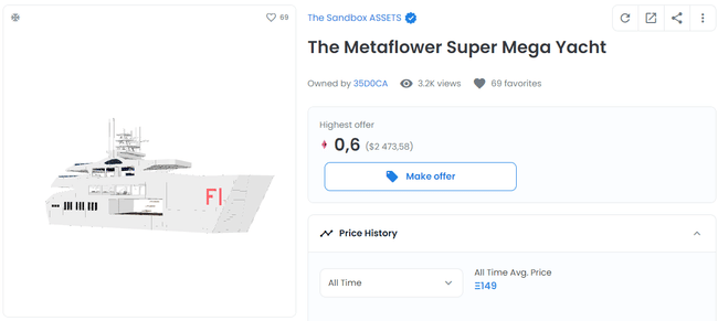 Metaflower Super Mega Yacht byl podle etherscan zakoupen za 149 $ETH/USD. Je popisována jako superluxusní megajachta, která má mimo jiné dýdžejský stánek, dvě přistávací plochy pro vrtulníky a vířivku. Jako první o tom informoval HypeBeast.