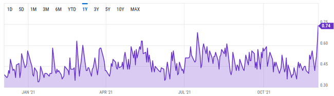 Dne 8. listopadu dosáhl poměr hodnoty 0,36, což je jedna z nejnižších hodnot od roku 1999. Zatímco obavy vyvolané novou variantou COVID-19 Omicron vedly minulý týden k nárůstu, ve středu činil 0,52 a v pátek dokonce 0,74, což je však podle historických standardů stále nízká hodnota.