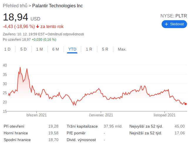 Akcie PLTR jsou 60 % pod svým vrcholem ze začátku letošního roku, kdy se cena za jednu akcii dostala dokonce na dnes neuvěřitelných 45 dolarů za kus. Stále však vzrostly o více než 150 % od svého debutu 30. září 2020, kdy společnost Palantir vstoupila na burzu s cenou 7,25 dolaru za akcii. Early investors tak mohou být relativně v klidu, trápení naopak mají investoři ze začátku roku 2021.