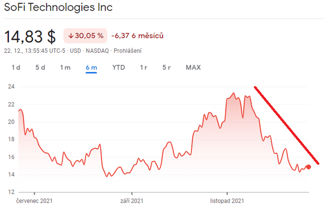 Relativně vysoce ceněné akcie SOFI dostávají v posledních týdnech pořádně zabrat. Akcie $SOFI tak klesly z maxima 24 dolarů na minimum kolem 14 dolarů. Tento pokles během několika krátkých týdnů vymazal zhruba 42 % hodnoty akcií. Dnes se obchodují blíže k 15 dolarům.