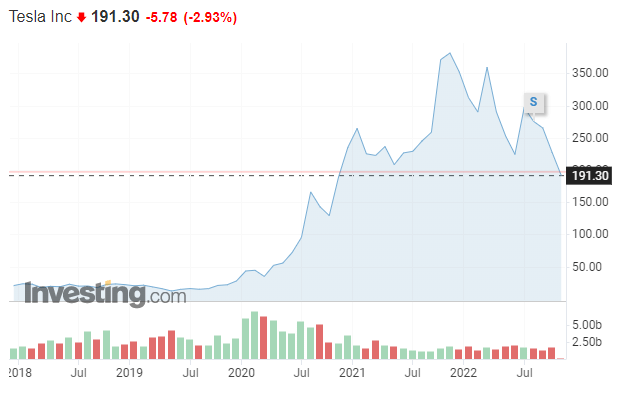 Výkonnost společnosti Tesla Inc. za posledních 5 let. (Zdroj: Investing)