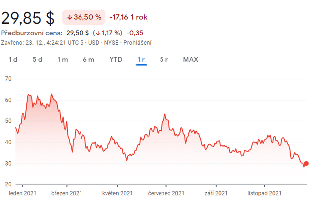 Akcie se ještě v únoru těšily ceně 60 dolarů, ale od té doby vykazují výraznou volatilitu 😅. Neustále klesají a dnes se obchodují za zhruba 30 dolarů. Navzdory současnému poklesu má však akcie podle mě plno potenciálu a v roce 2022 by se mohla zdvojnásobit 😁.