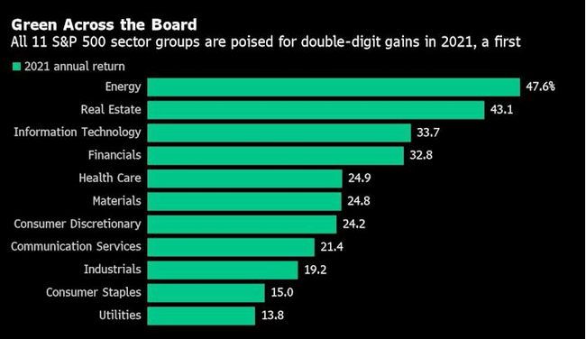 Největším letošním vítězem je energetický index indexu $SPX, který si polepšil o více než 47 % poté, co byl v roce 2020 se ztrátou více než 37 % nejhorší. Naposledy skončilo však všech 11 skupin v zelených číslech v roce 2019, ale pouze 10 z nich zaznamenalo dvouciferný růst: Energetika zaznamenala jednociferný nárůst o 7,6 %. Devět sektorů však zaznamenalo zisky ve výši 20 % a více.