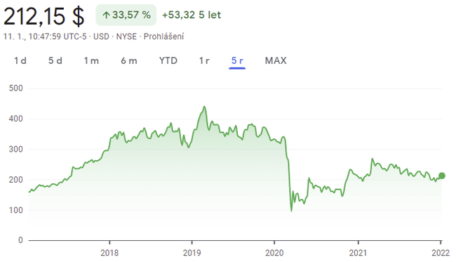 Akcie Boeingu $BA si za poslední měsíc připsaly zhruba 5 %. Společnost by potenciálně mohla mít dvě ze svých letadel opět v provozu a další spustit ještě letos. Pád $BA začal rok předtím, než letecký průmysl pohltila pandemie. Bylo to kolem druhé katastrofy letounu 737 Max, která stáhla akcie o více než 17 %. Když však pandemie udeřila, akcie se propadly o více než 70 % a v březnu 2020 dosáhly minima 89 dolarů.