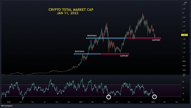 V podstatě jde o to, že za poslední rok celková tržní kapitalizace kryptoměnového trhu konzistentně vykazovala silnou podporu na předchozích úrovních rezistence.