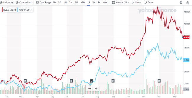 Při vstupu do nového roku však obě akcie utrpěly mírný pokles v důsledku poklesu širšího trhu vyvolaného blížícím se zpřísněním měnové politiky. Nedávné zveřejnění zápisu z prosincového zasedání Federálního rezervního systému spolu se stále více jestřábími výroky představitelů Fedu naznačily naléhavou potřebu rychlejšího a dřívějšího zvyšování sazeb s cílem zkrotit inflaci. To sice podnítilo strach mezi akciovými investory, kteří přemýšlejí o tom, jak do ocenění aktiv započítat dopady nadcházejícího zvýšení sazeb, což v posledních týdnech vedlo ke zvýšené volatilitě na trhu, lze se však domnívat, že akcie společností Nvidia a AMD z toho vyjdou příznivě vzhledem k jejich vysokému růstovému potenciálu a stabilní povaze jejich podnikání.