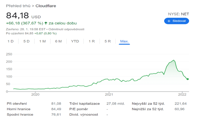Navzdory velmi dobrým výsledkům společnosti Cloudflare a příznivému výhledu poptávky dostalo její ocenění na frak :(, protože trh se odklonil od společností zabývajících se cloudovým softwarem. Akcie se oproti svému maximu propadly zhruba o 62 % a tržní kapitalizace společnosti nyní činí zhruba 28,5 miliardy USD. Její ocenění ve výši zhruba 29násobku může být na první pohled zastrašující. Rychle rostoucí tržby a fantastické marže ale ukazují na velký potenciál zisku a na to, že společnost Cloudfare je vybavena hvězdným motorem dlouhodobého růstu. TO THE MOON!