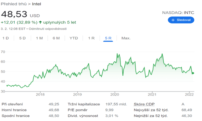Pointa je v tom, že Intel má všechny nástroje a možnosti, které mají AMD a NVIDIA. Vedení musí zvednout laťku a přeorientovat pozornost investorů na to, co je důležité. Vlastnictví akcií INTC má velmi malé riziko poklesu. Hodnota 48 USD za akcii je supportem již od roku 2017.