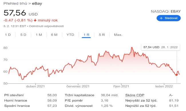 Jedná se spíše o krátkodobou příležitost (založenou na technických indikátorech). Na rozdíl od předchozích dvou. Přesto se fundamentálně společnosti eBay daří dobře. Společnost loni dosáhla hrubého zisku 8,2 miliardy dolarů. Navíc má P/E 3,5, což je v porovnání se zbytkem konkurence nízká hodnota.