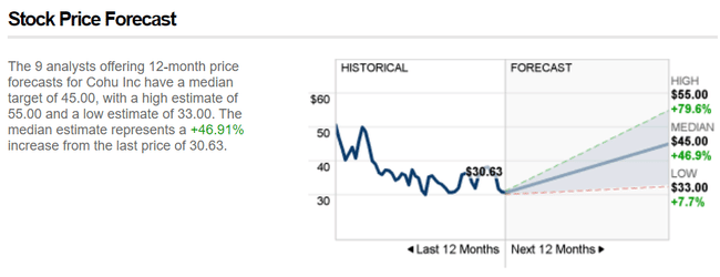 Akcie Cohu se v současnosti obchodují kolem 30 USD za akcii a společnost Rosenblatt Securities z Wall Street jim stanovila cílovou cenu 65 USD, což představuje 116% nárůst. Není však sama, šest dalších analytiků drží pro akcie Cohu doporučení koupit a pouze jeden analytik doporučuje prodat. Jejich průměrná cílová cena je 46,71 USD, což je téměř o 56 % více, než za kolik se obchoduje dnes.