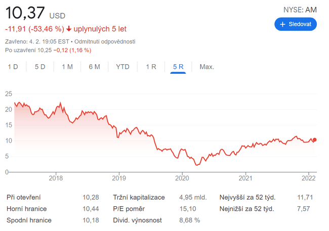 Třetí akcií s velmi vysokým výnosem, která by mohla investorům v roce 2022 pomoci vygenerovat příjem nad úrovni inflace, je společnost Antero Midstream. I po snížení dividendy v roce 2021 vyplácí Antero Midstream výnos téměř 9 %.