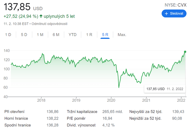 V prostředí rostoucích cen energií akcie Chevronu za poslední rok vzrostly o více než 50 %. Přesto se stále obchodují s poměrem ceny k zisku (P/E) přibližně 17, což je jen o něco málo více než poměr 15 P/E společnosti ExxonMobil $XOM, která měla v prvním roce pandemie těžší období. Vzhledem k dnešním vysokým cenám ropy a atraktivní dividendě Chevronu zůstává tato akcie atraktivní volbou.