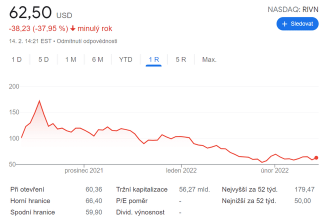Společnost Rivian zatím nedosahuje významných tržeb. Společnost teprve rozjíždí výrobu ve svém novém montážním závodě v Illinois. Wall Street očekává, že Rivian dodá v roce 2022 přibližně 40 000 elektromobilů.