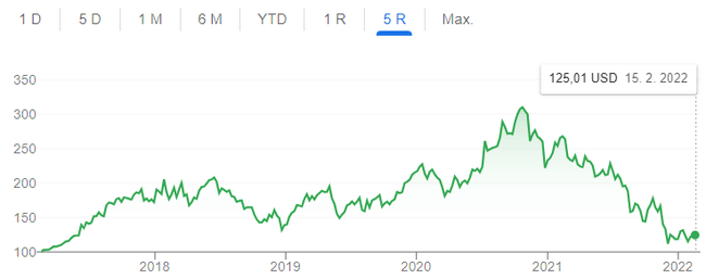 Z vrcholu 317,15 USD v listopadu 2020 vytrvale klesala po celý rok 2021. Za celý rok se propadla o 49 % a 31. prosince 2021 skončila na 118,79 USD.