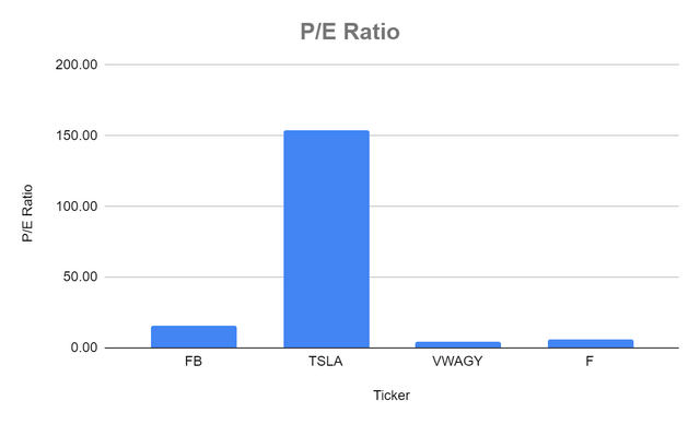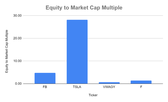 TSLA se také obchoduje s největším poměrem vlastního kapitálu k tržní hodnotě 28,14x oproti 4,79x u FB, 0,69x u VWAGY a 1,45x u F.