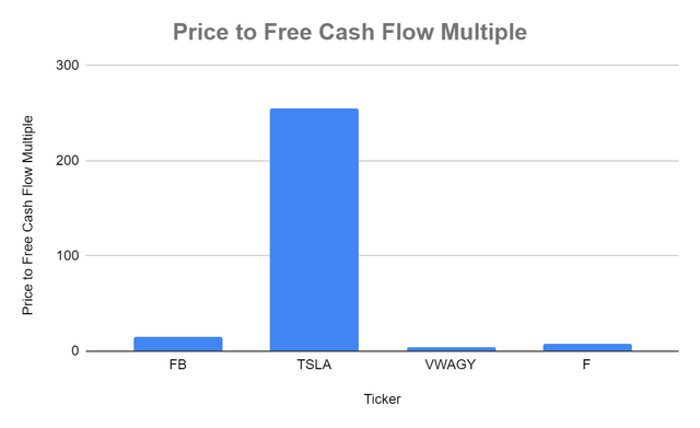 TSLA se obchoduje na 255,19násobku FCF ve srovnání s 15,28násobkem FB. Na straně automobilek se VWAGY obchoduje s 3,95násobkem FCF, zatímco F s násobkem 7,35x.