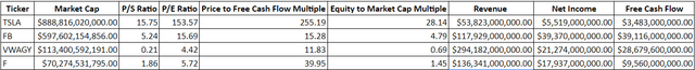 Srovnám TSLA s FB, Fordem (F) a Volkswagenem (OTCPK:VWAGY) a výsledky vás možná překvapí. TSLA má tržní kapitalizaci 888,82 miliardy USD, takže FB, který má nyní tržní kapitalizaci 597,6 miliardy USD, používám jako technologickou společnost a F a VWAGY jako automobilové společnosti. Než projdu metriky ocenění, které používám, chci uvést stručný rámec každé společnosti: