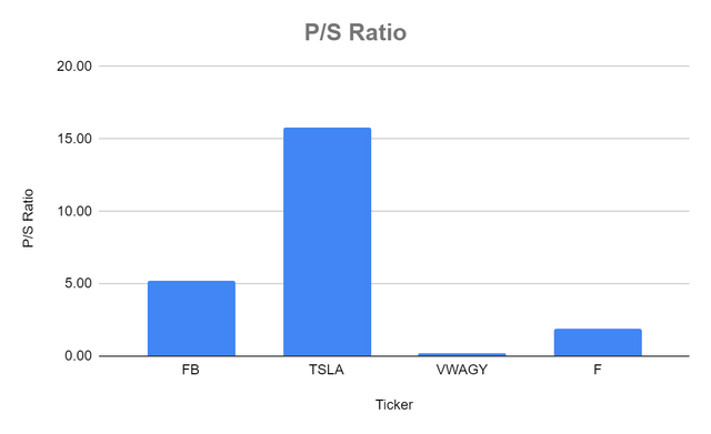 TSLA se obchoduje s poměrem P/S 15,75x ve srovnání s 5,24x u FB, 0,21x u VWAGY a 1,86x u F. TSLA se obchoduje výrazně nad některými velkými výrobci automobilů a výrazně nad FB v poměru P/S.