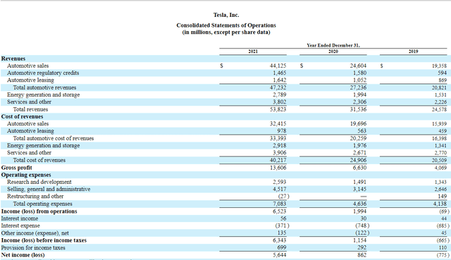 Přesto dodnes lidé řadí TSLA mezi technologické společnosti. TSLA má jeden z největších kultů, a to právem, vyrábí fantastický produkt, ale při investování záleží na detailech. Přál bych si, aby všichni, kdo argumentují tím, že TSLA je technologická společnost, přestali používat "co kdyby" z potenciálního příběhu o budoucnosti a drželi se faktů, která jsou uvedena v každé čtvrtletní zprávě nebo výroční zprávě TSLA 10-K. Rok 2021 byl pro TSLA rekordním rokem z hlediska tržeb a zisku a jasně naznačuje, že TSLA je bezpochyby automobilovou společností.