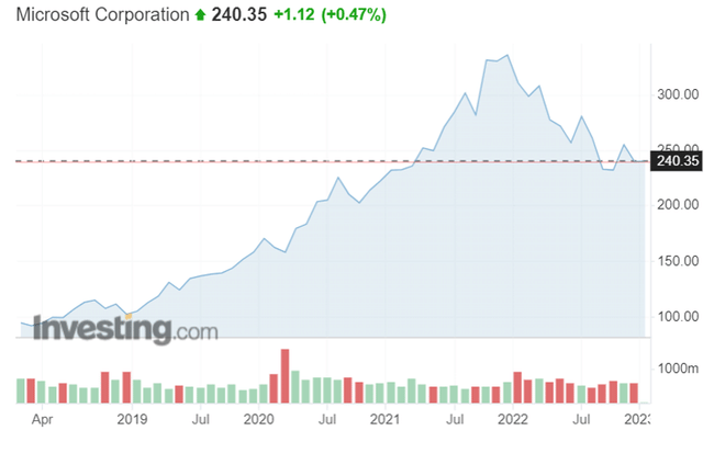 Technologický sektor zažil v uplynulém roce celkový pokles, konkrétně akcie Microsoftu se za poslední rok propadly o 23 % a v současné době se pohybují kolem 240 dolarů za akcii.* Gigant Microsoft by mohl časem snížit počet svých zaměstnanců až o třetinu. Očekávání jsou v současné době spíše negativní a očekává se, že Microsoft ve svém druhém fiskálním čtvrtletí, kdy 24. ledna oznámí své výsledky, zaznamená nejpomalejší růst tržeb od fiskálního roku 2017, a to pouhá 2 %.