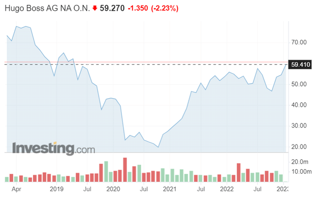 Spoločnosť Hugo Boss Ag Hugo Boss N Ord Shs je kótovaná na Londýnskej burze cenných papierov a trhová kapitalizácia je v priemere 4 095 mil. Eur. Na trhu je približne 69 mil. Napriek správe o výnimočných ziskoch akcie spoločnosti zaznamenali mierny pokles zhruba o 1%. *